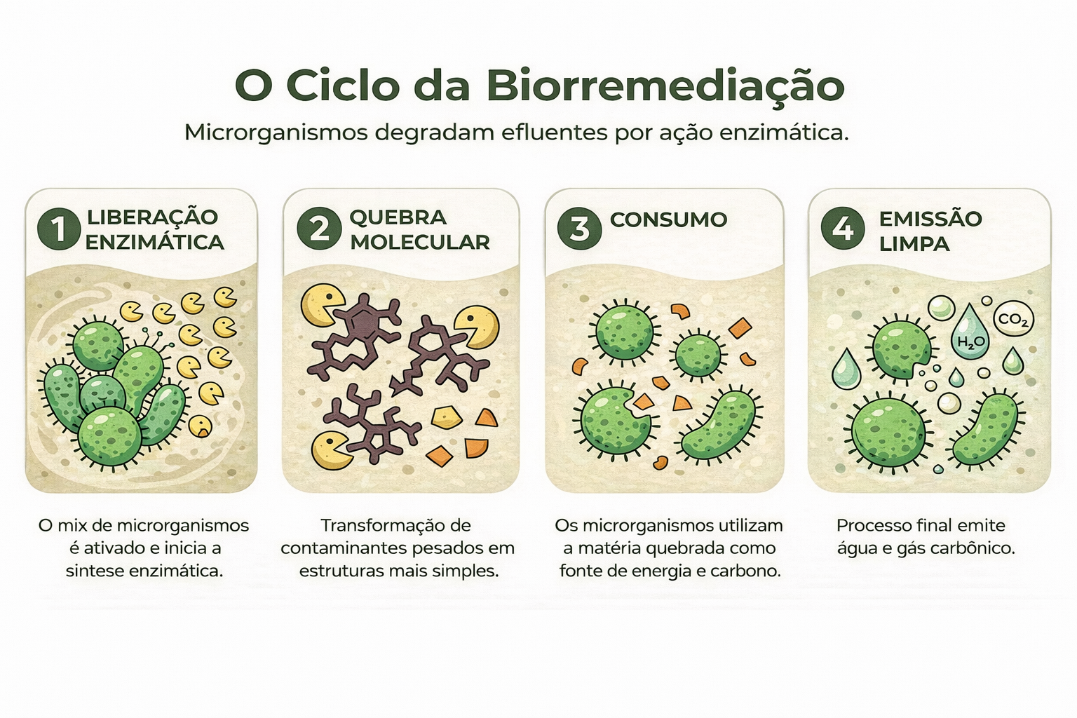 O ciclo da biorremediação: liberação enzimática, quebra molecular, consumo e emissão limpa.